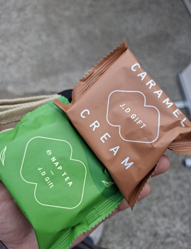 昨天很榮幸有遇到再睡五分鐘在擺攤,看到攤位有賣像中秋禮盒的商品,於是好奇心驅使了我,買了各一個口味來試試看!對了!這是和簡單李聯名一起出的禮盒,是夾心餅乾喔!解決這兩個是分分鐘的事🤣1號選手 焦糖奶油在網路上找才發現是簡單李的經典款內餡 一面底下是焦糖上面是奶油單吃奶油是走比較清爽路線,不會太甜膩咬到將近一半,焦糖會牽絲,特別驚豔,超好吃😋營養標示👇👇👇2號選手 棉被午綠奶蓋